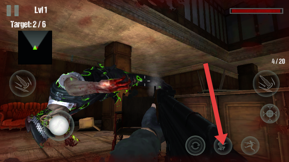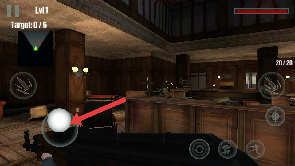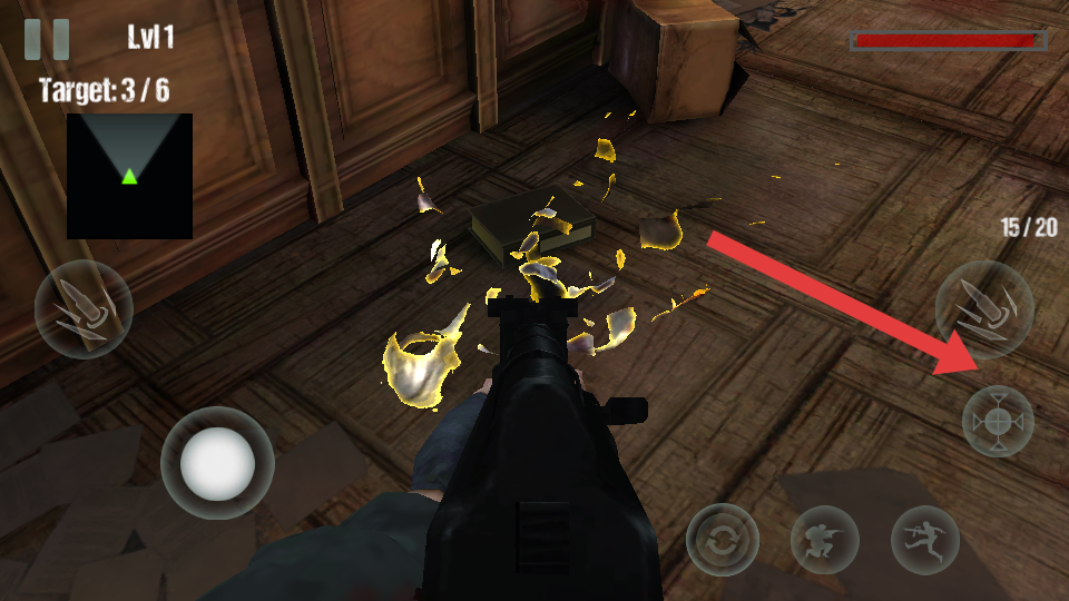 2、基本玩法,以第一人称视角在复古木质大厅中操控枪械,攻击带有绿色荧光的僵尸;屏幕的左上角显示任务的进度。