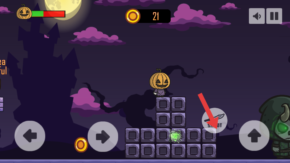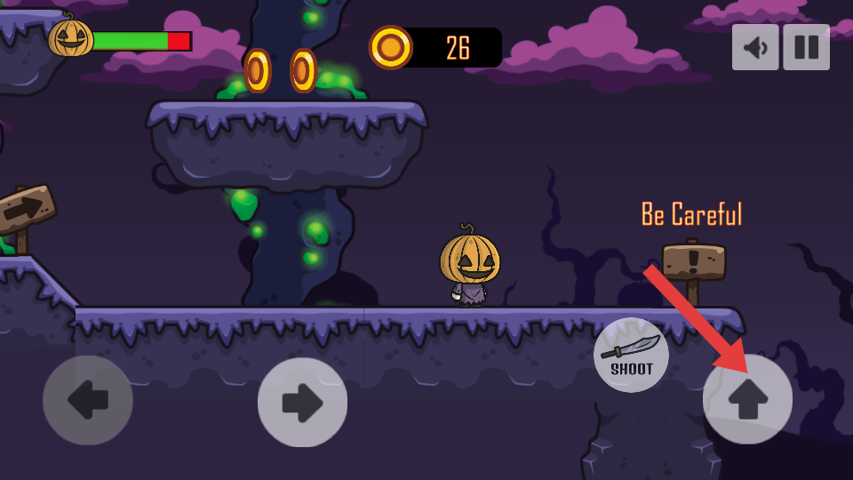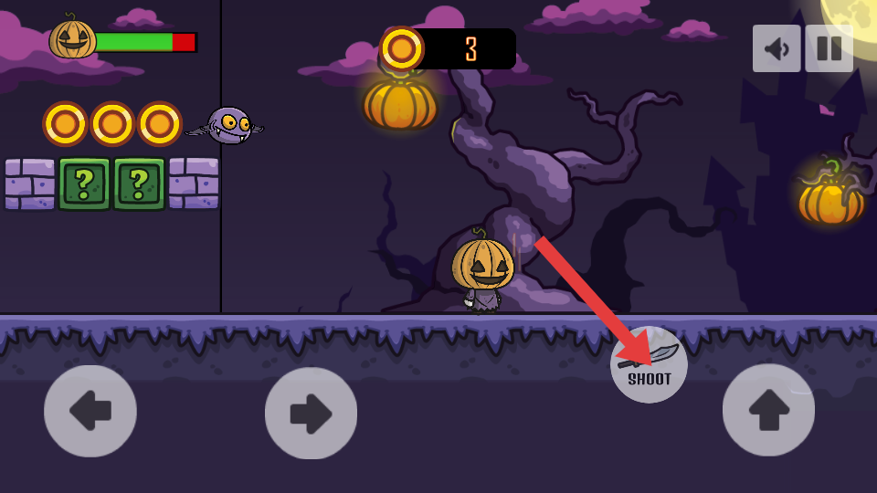 2、核心玩法,操控南瓜头形象的角色,万圣节风格场景中进行平台跳跃探索,同时躲避或攻击紫色小怪物、绿骷髅敌人。