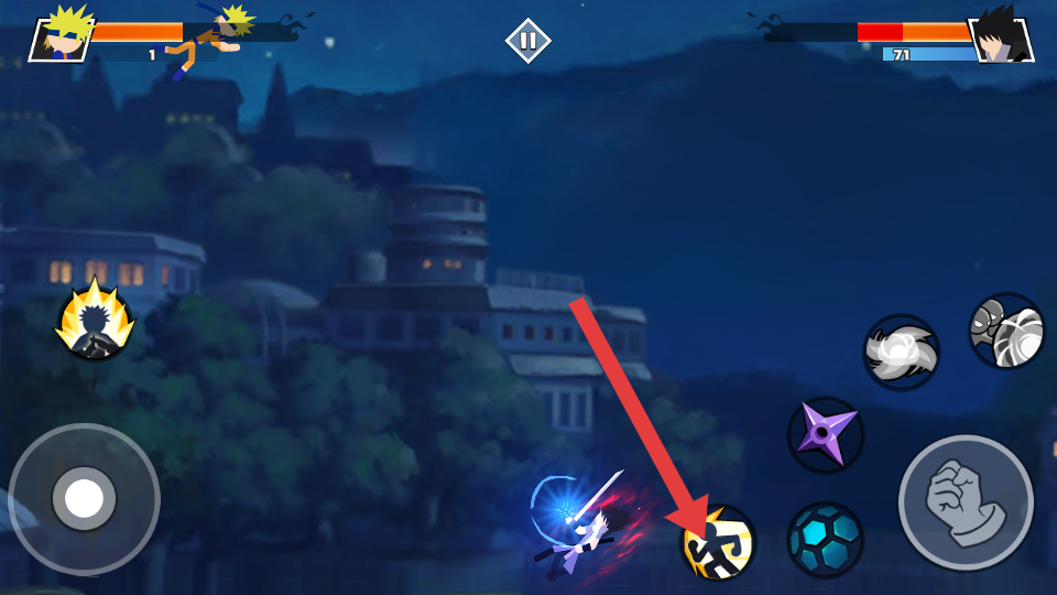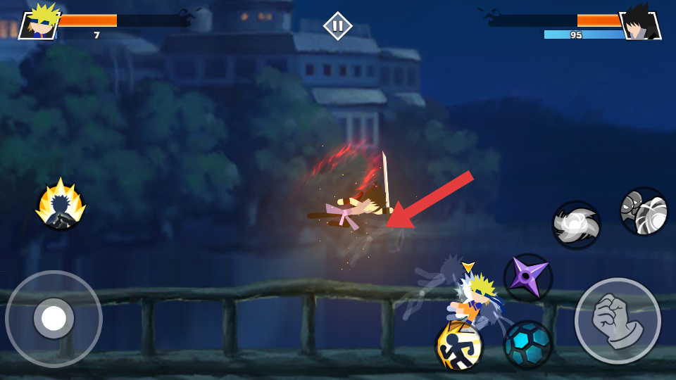 1、卡通场景与特效烘托对决氛围:激烈的比赛场景采用卡通风格打造,炫酷的技能特效在横版画面中清晰呈现,从忍术释放的光芒到打击产生的动态效果。