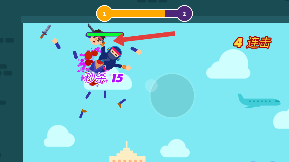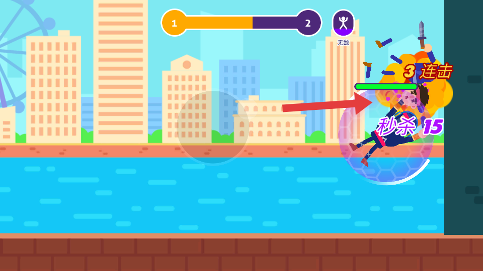 1、角色忍者等造型可触发秒杀15高伤害效果,同时能积累3连击4连击combo,战斗过程中伴随爆炸、角色击退等视觉特效。