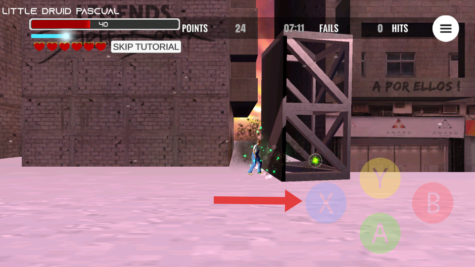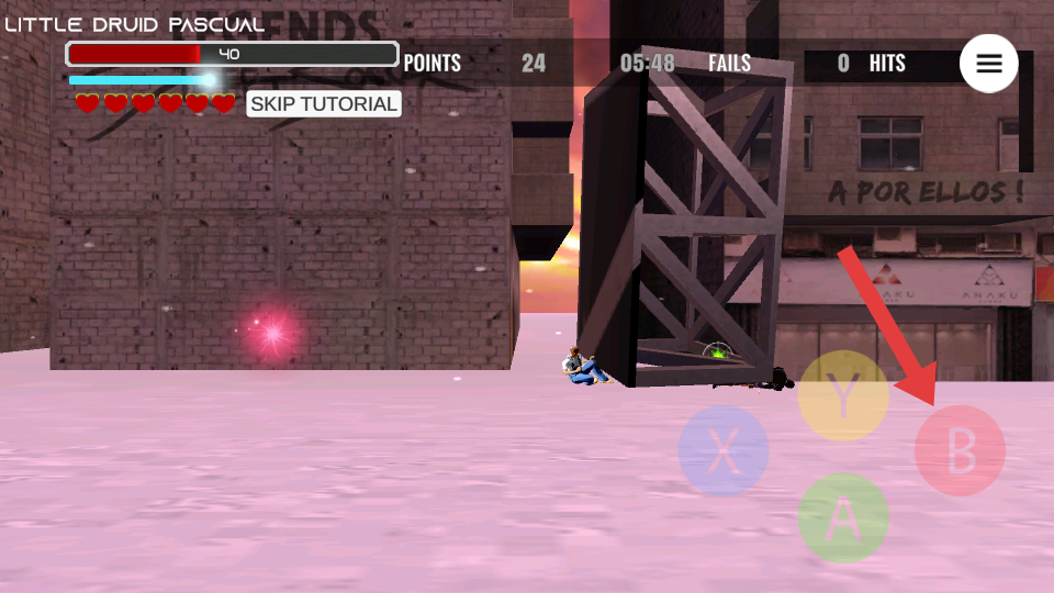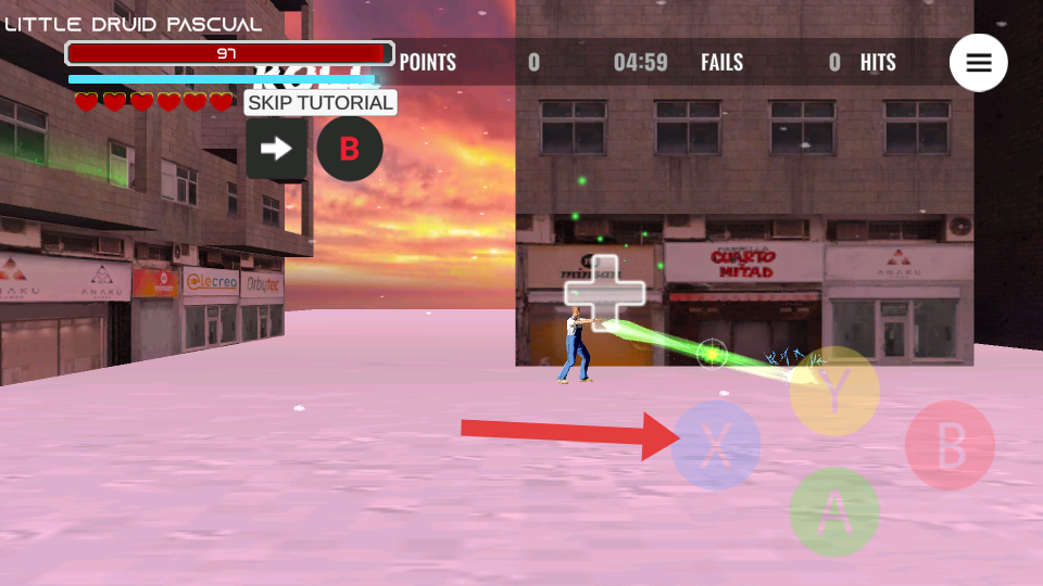 3、教程与状态管理,关注屏幕上方红色血条,POINTS分数及倒计时,若无需教程引导,点击按钮跳过,进入实战操作阶段。