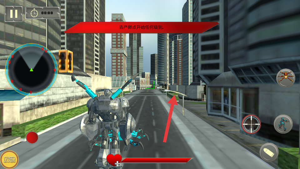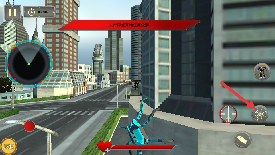 1、进入游戏后直接解锁变形蜘蛛机器人基础形态,通过虚拟摇杆控制机器人在城市地面移动,点击攀爬按钮即可附着在建筑墙面,开启垂直移动探索。