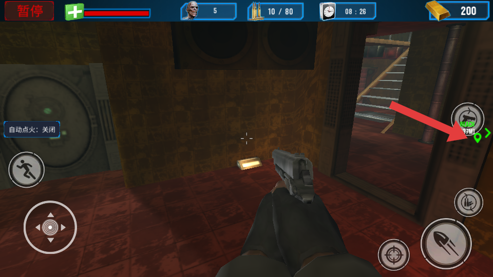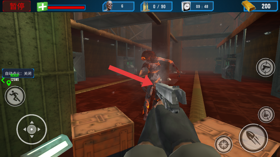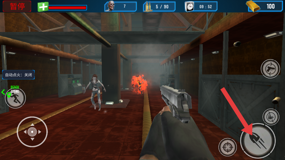 1、进入工厂场景后,利用左侧摇杆移动,操控枪械瞄准丧尸射击,同时需要留意上方生命值与任务的进度。