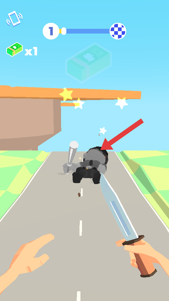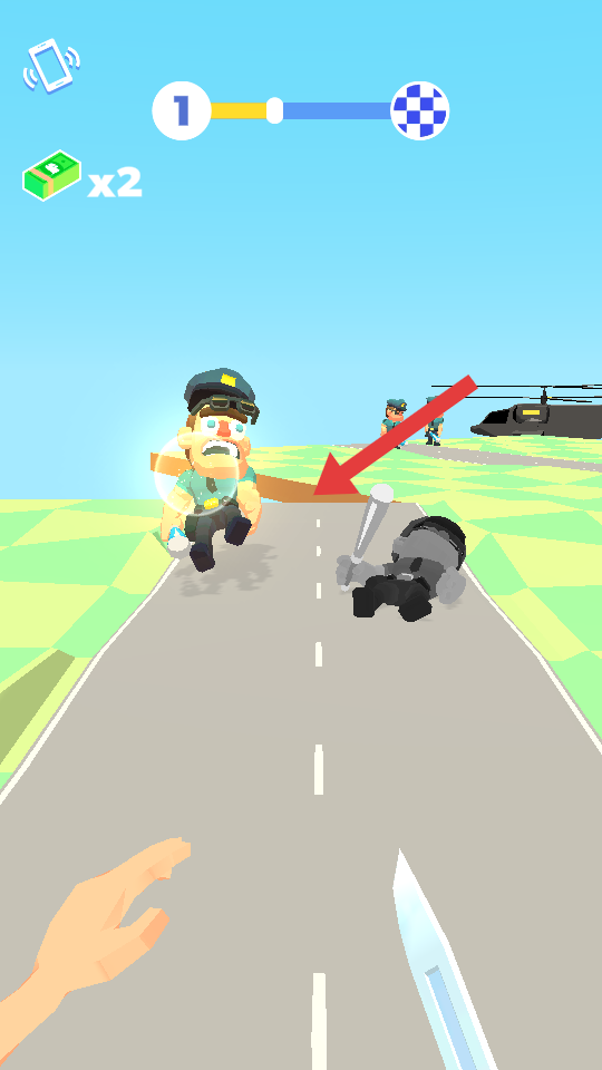 1、游玩中操控角色用武器来攻击道路上的敌人,同时来收集空中的钞票的道具,推进关卡的进度。