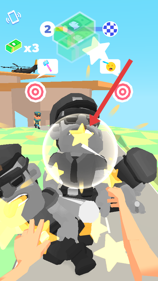 2、遇到警察类敌人时,保持攻击节奏,击败敌人可增加钞票数量,注意背景中直升机等场景的元素。