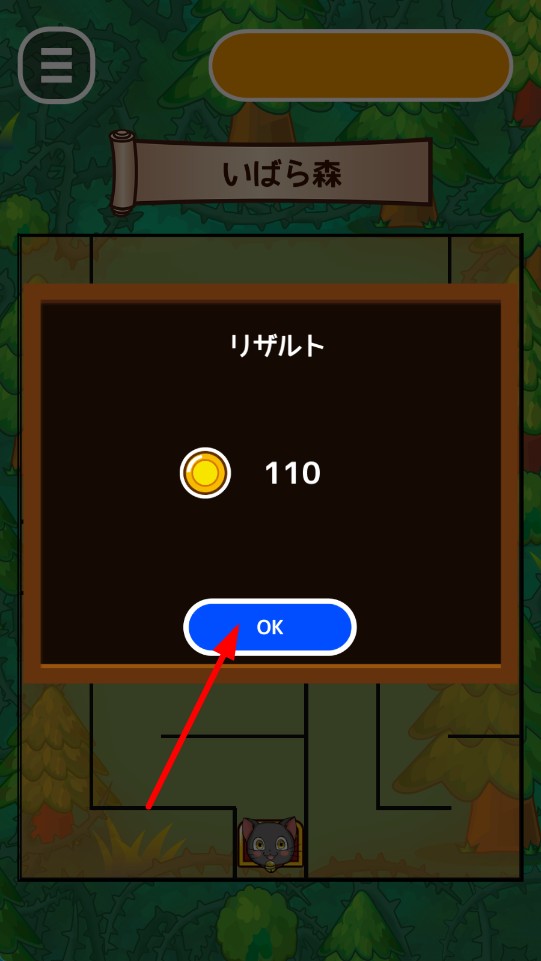 4、成功到达宝箱后,会弹出显示“リザルト”(结果)及获得110金币的界面,点击“OK”按钮,完成该关卡。