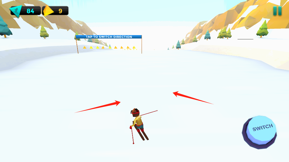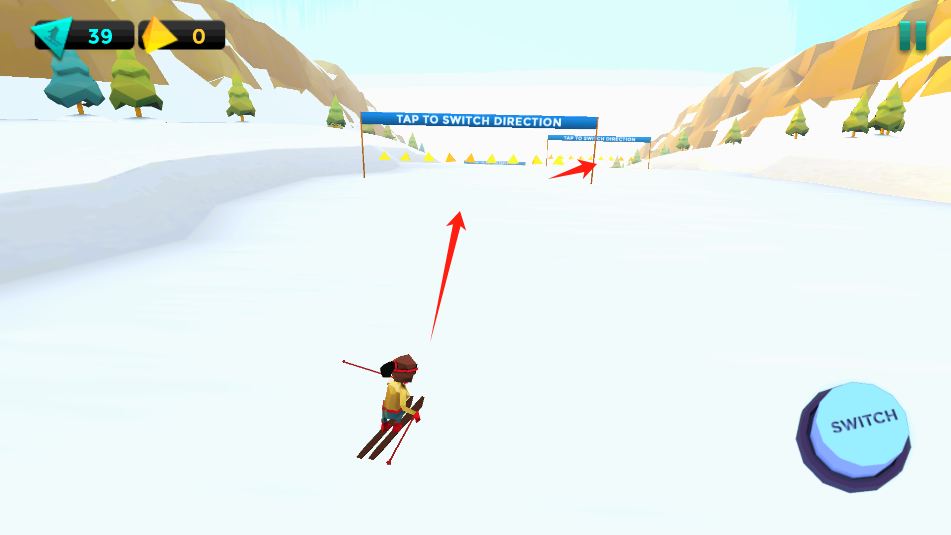 2、核心为无尽滑雪玩法,交替点击屏幕控制方向,需绕过障碍、收集星星、冲向加速带。