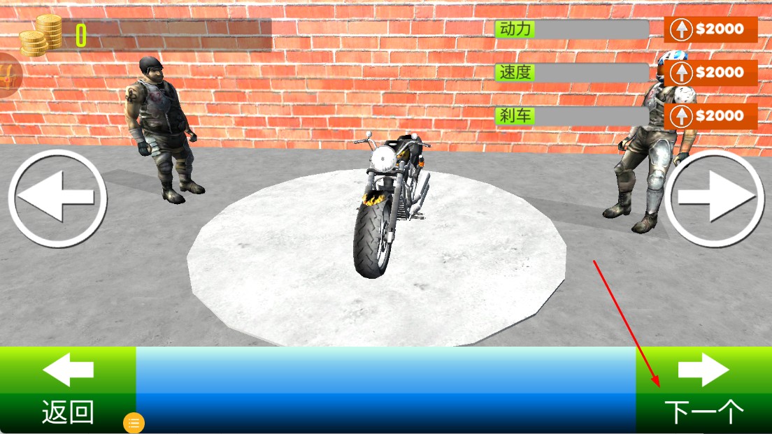 2、在摩托选择界面,切换不同摩托,挑选心仪座驾。点击【下一个】开始游戏。