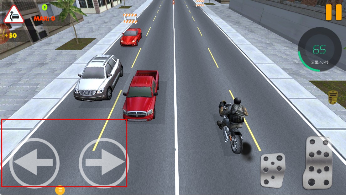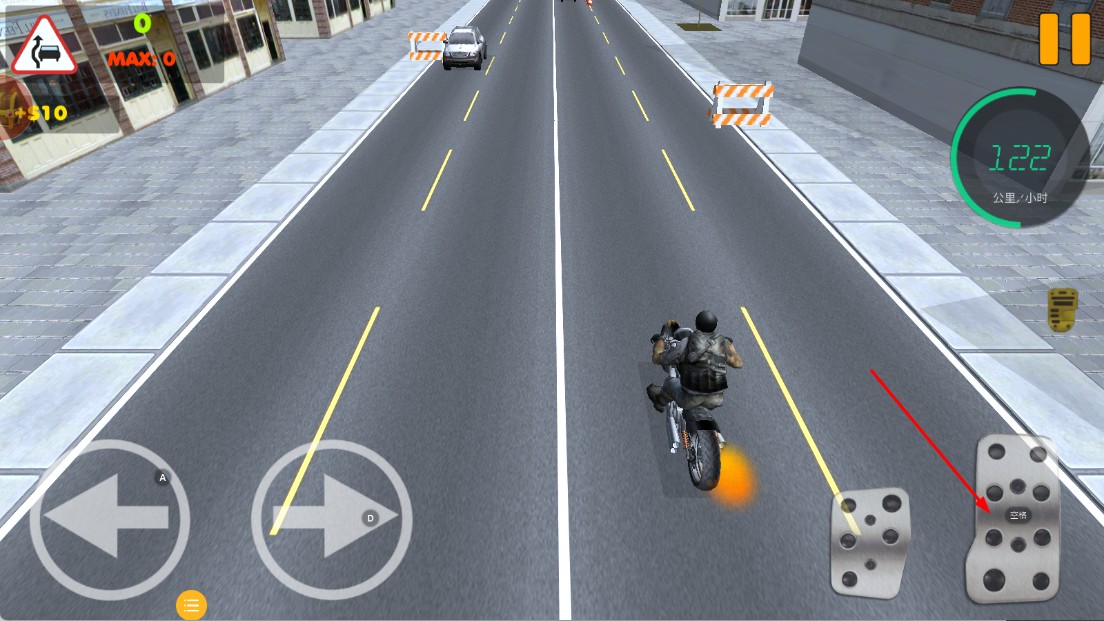 3、驾驶时,用左右方向键,控制摩托转向,避开道路上的车辆。