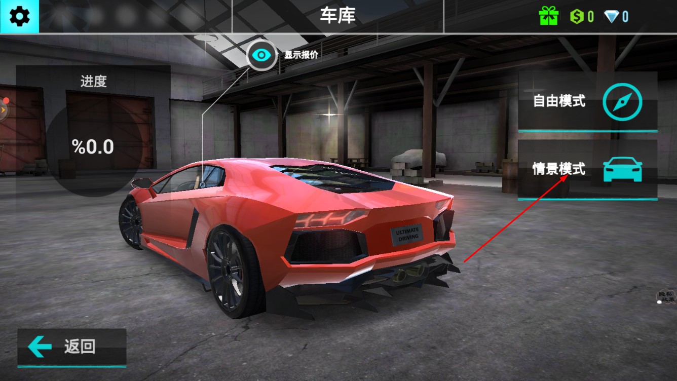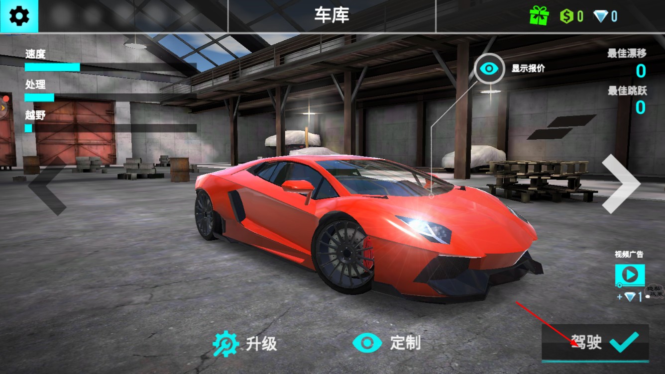 1、在车库选好红色跑车,点击【驾驶】,进入游戏。