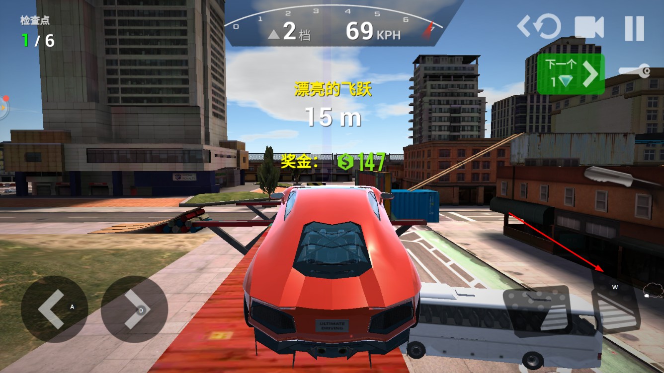 3、驾驶时,按右侧加速键,提升车速,完成“漂亮的飞跃”等动作,获取奖金。