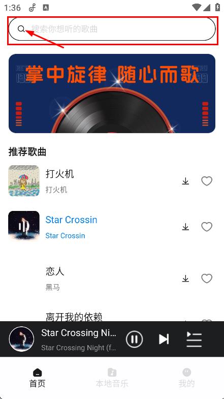 1、在应用首页,点击搜索你想听的歌曲的搜索框,进入搜索页面。