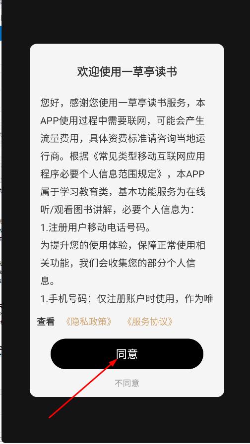 1、在欢迎使用一草亭读书弹窗中,点击同意,进入主页面。