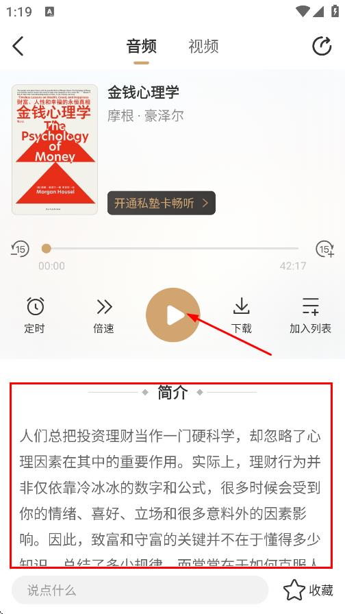 4、在书籍音频页面,点击播放按钮,开始收听音频内容。