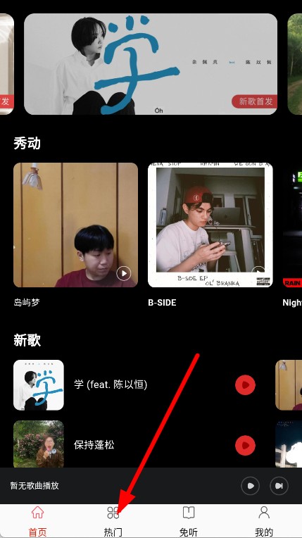 1、打开快听免费音乐大全,点击底部热门。
