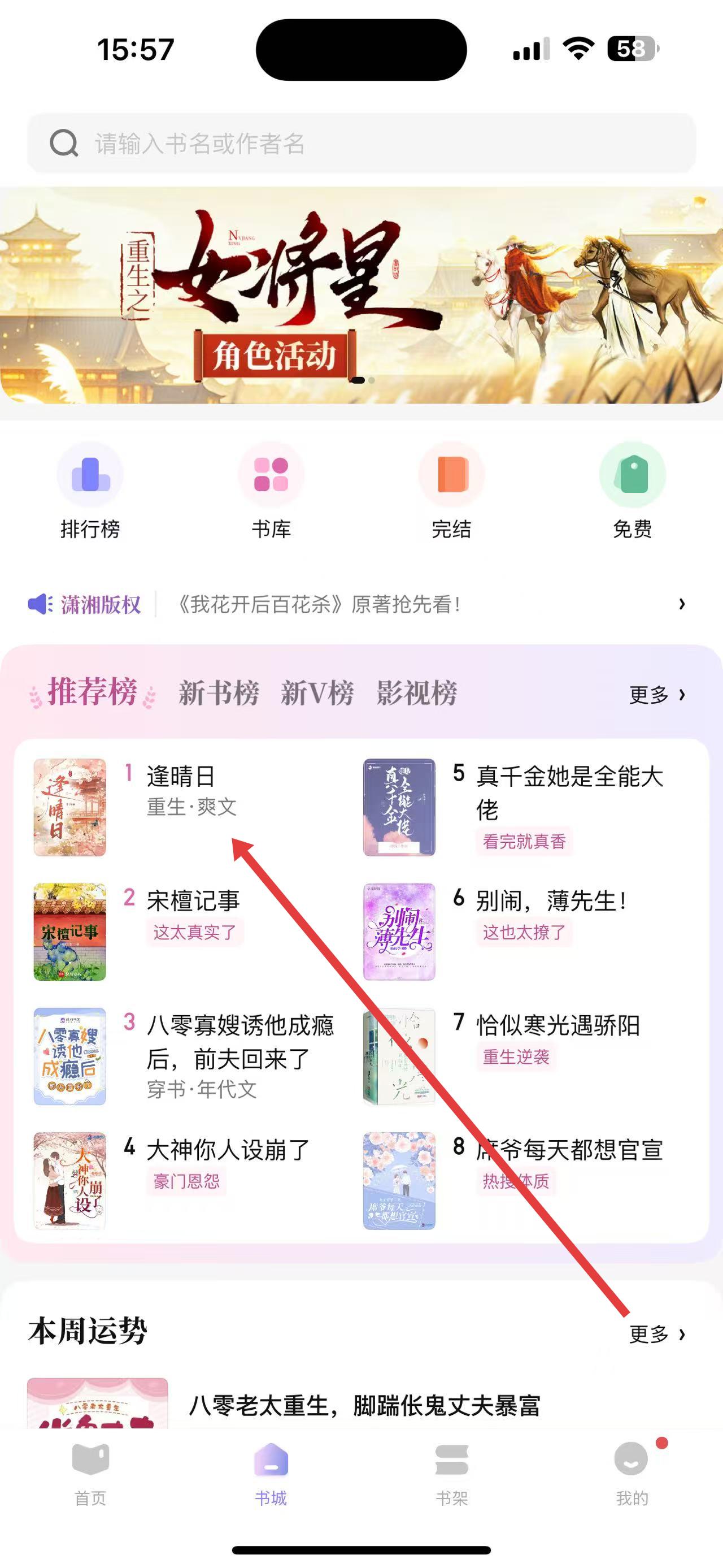 1、打开潇湘书院APP,在首页的推荐榜单等位置,选择想收听的小说,比如逢晴日。