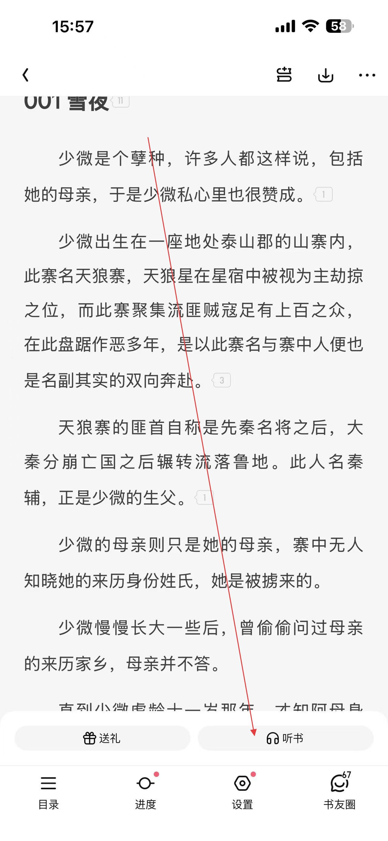 3、在小说阅读界面中,点击屏幕下方的听书按钮,即可开始收听该小说。