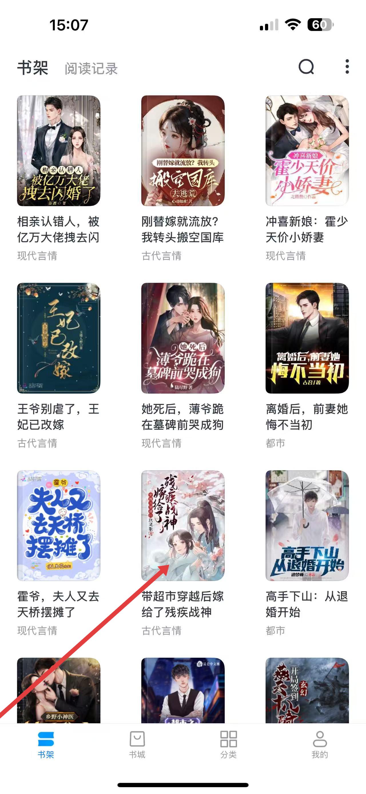 1、打开淘淘小说APP,进入书架界面,点击想阅读的小说封面,如带超市穿越后嫁给了残疾战神。