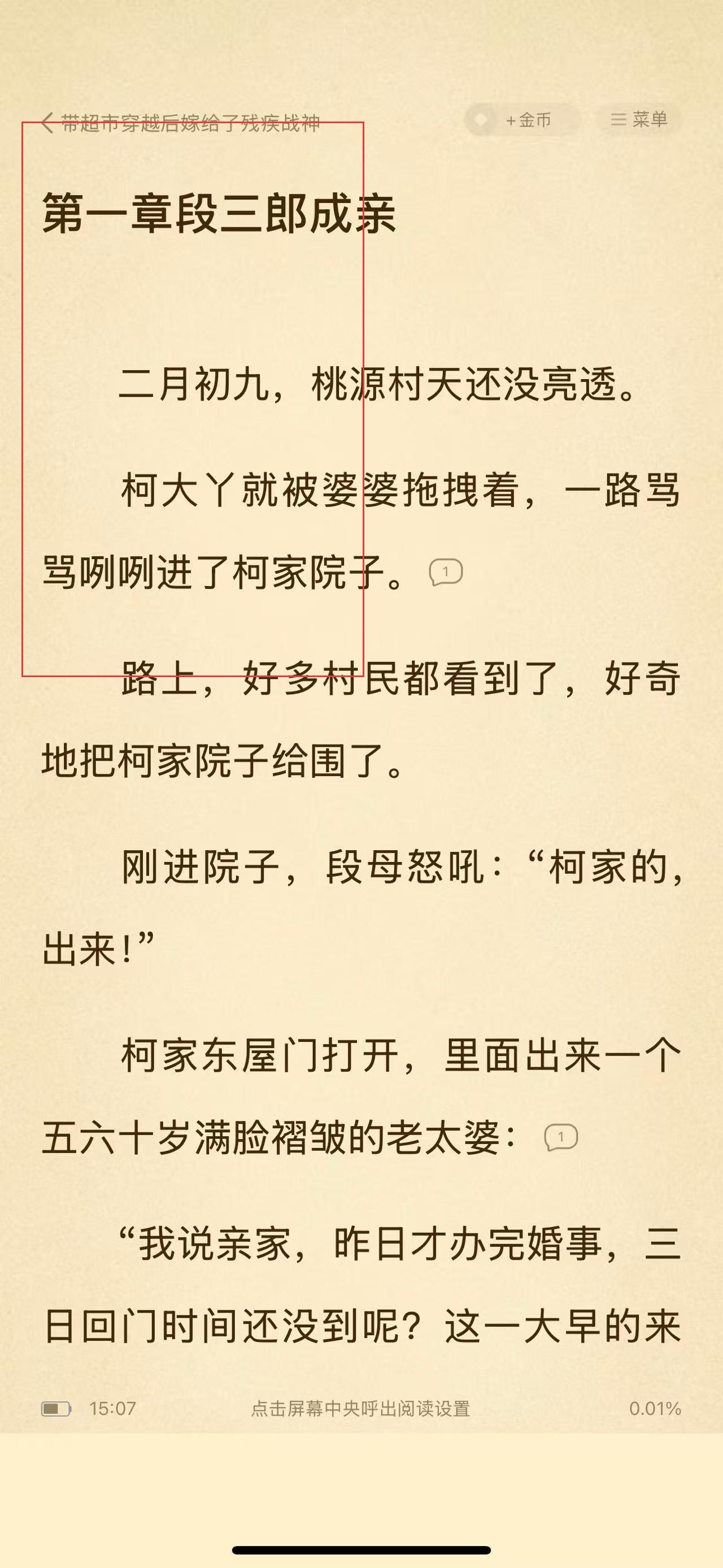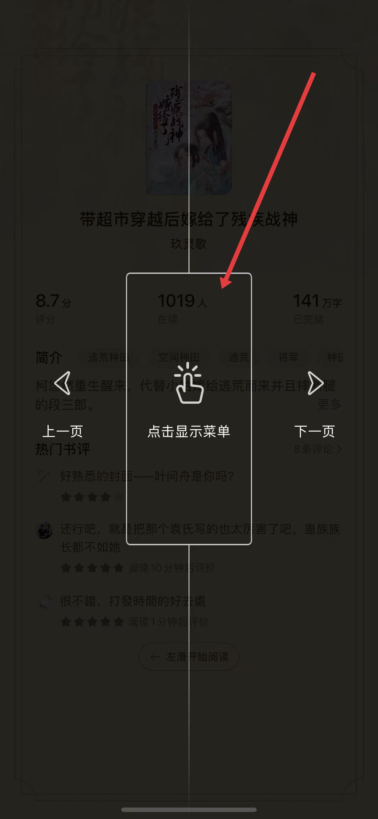 2、在小说详情页中,点击屏幕中间位置,出现点击显示菜单提示,再次点击调出阅读操作菜单。
