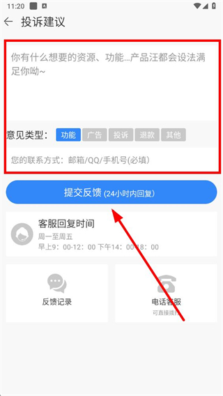 3、进入页面后,在上方文本框输入想要反馈的内容,选择意见类型,填写联系方式,点击提交反馈按钮。