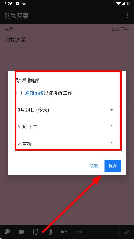 3、点击底部的闹钟图标,设置提醒时间,点击保存。
