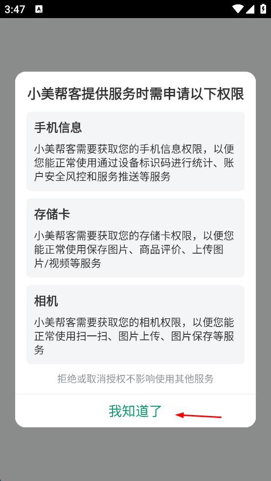 1、打开小美帮客App,出现权限申请弹窗,阅读后点击我知道了按钮。