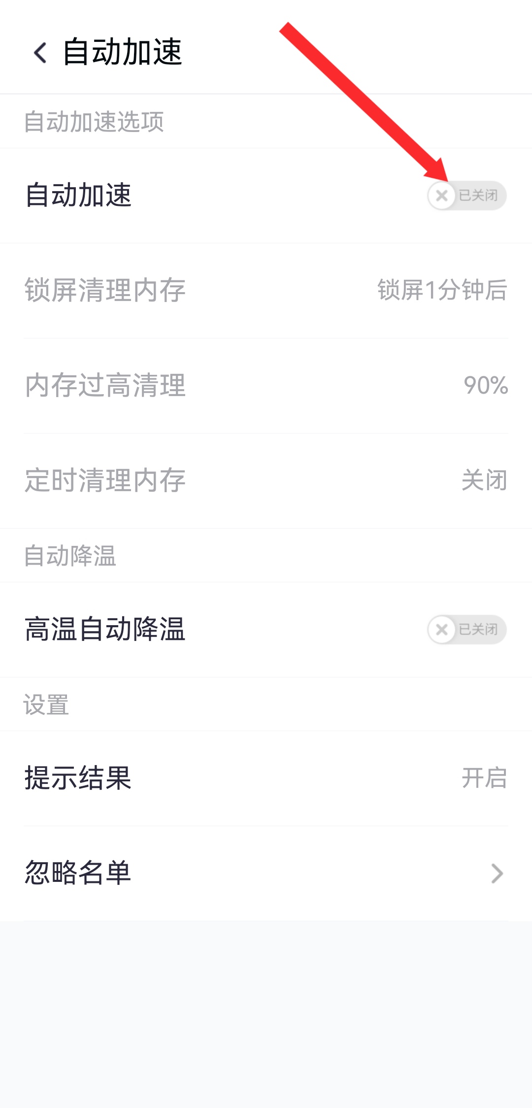 4、在自动加速设置页面,开启自动加速的开关,完成功能开启。