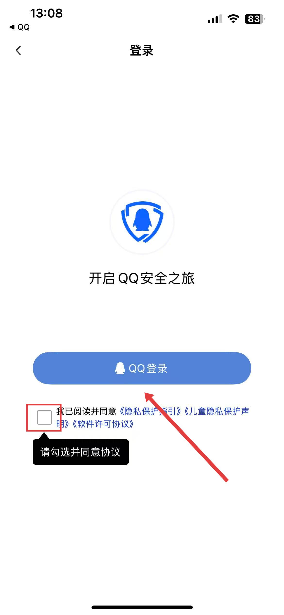 3、进入登录界面,勾选我已阅读并同意相关协议,然后点击QQ登录。