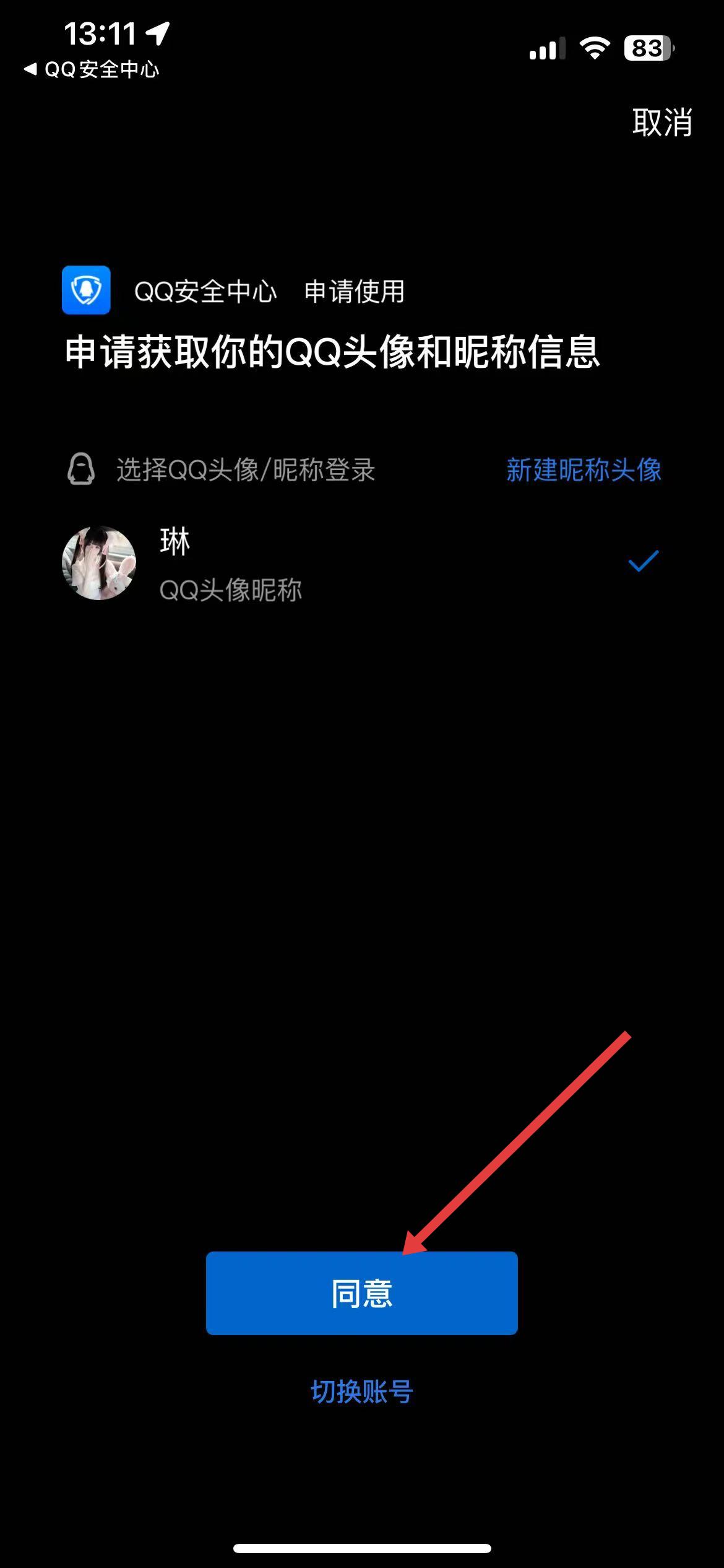 4、在弹出的申请获取信息界面中,选择要登录的QQ,点击同意,即可绑定其他QQ账号。
