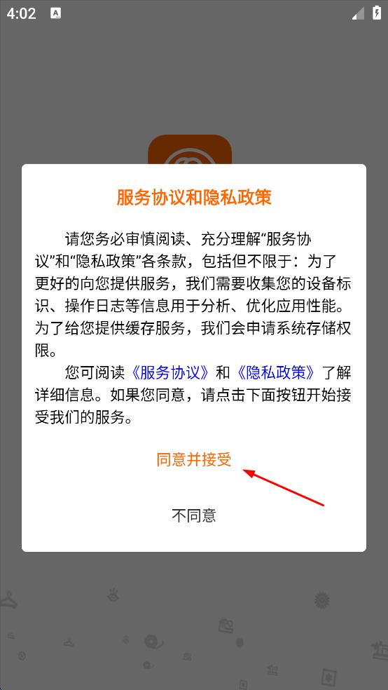 1、打开棉花果APP,出现服务协议和隐私政策界面,仔细阅读后点击“同意并接受”,进入登录选择页面。