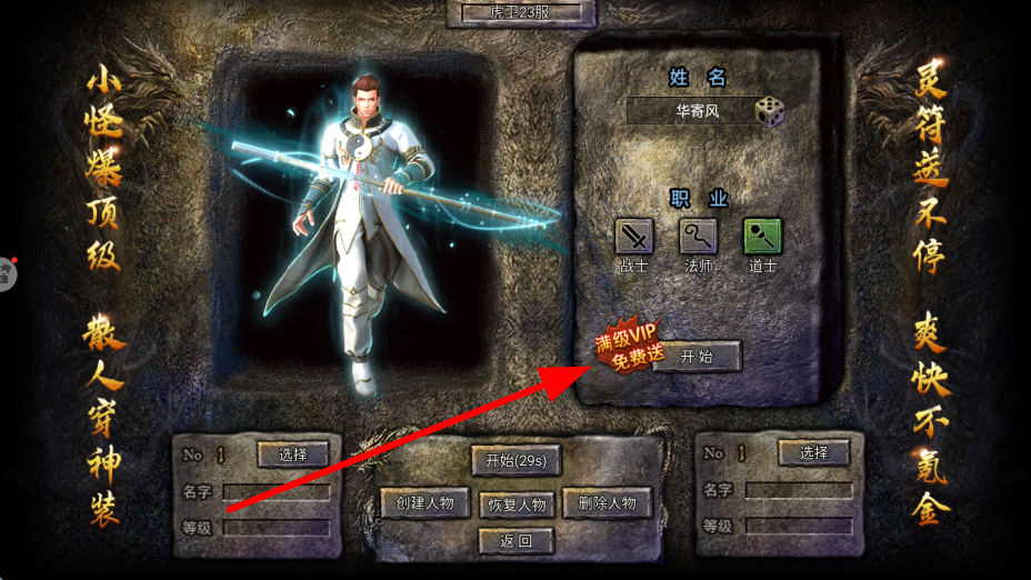 1、创建角色界面,可选择战士、法师、道士等职业,选定职业后,还能进行名字等设置,完成后即可进入游戏世界,开启冒险。