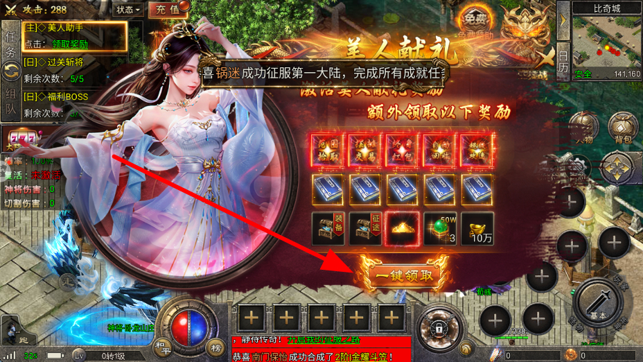 3、遇到奖励领取界面时,点击一键领取,可快速获取各类奖励,这些奖励包括装备、资源等,能用于提升角色的能力与装备水平。