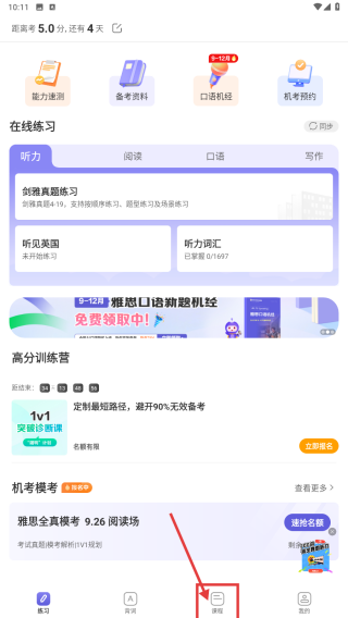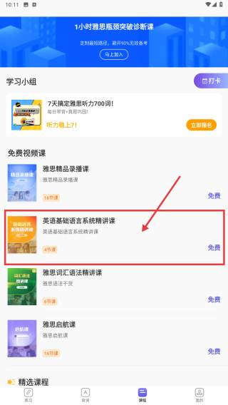 1、打开雅思学习APP,点击底部课程选项,进入课程推荐页面。