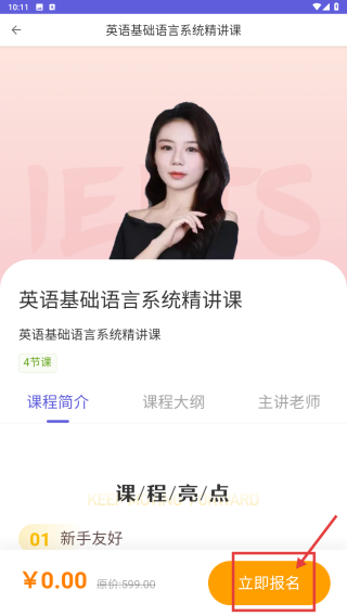 2、在课程推荐页面,点击英语基础语言系统精讲课条目,进入课程详情页。