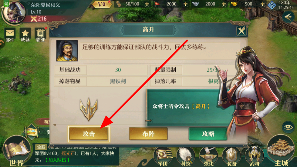 2、遇到可攻击的目标时,点击攻击按钮,发起攻击指令,让部队向目标进军,开启战斗,获取战功等奖励,提升实力。