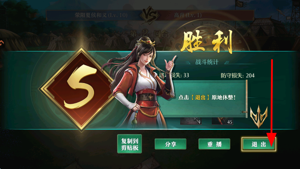 4、战斗结束后,会显示战斗结果,若取得胜利,可查看战斗统计,了解损失等情况,之后点击退出,结束此次战斗。