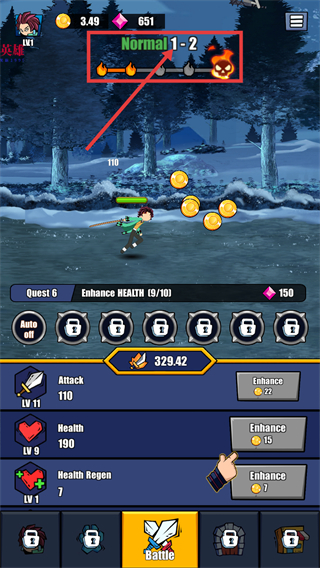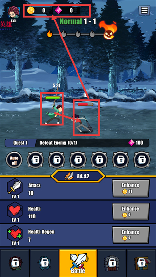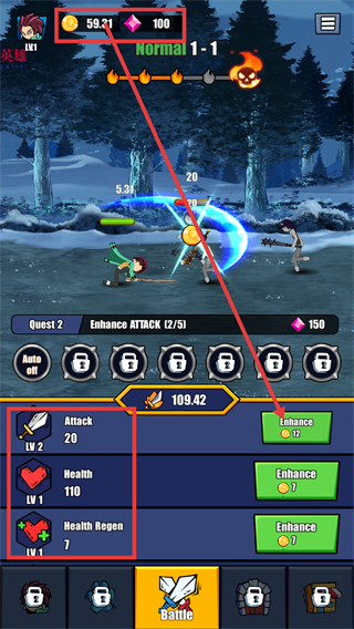 3、利用战斗获得的金币,点击【Enhance】按钮,提升攻击、生命等属性,强化角色战力。
