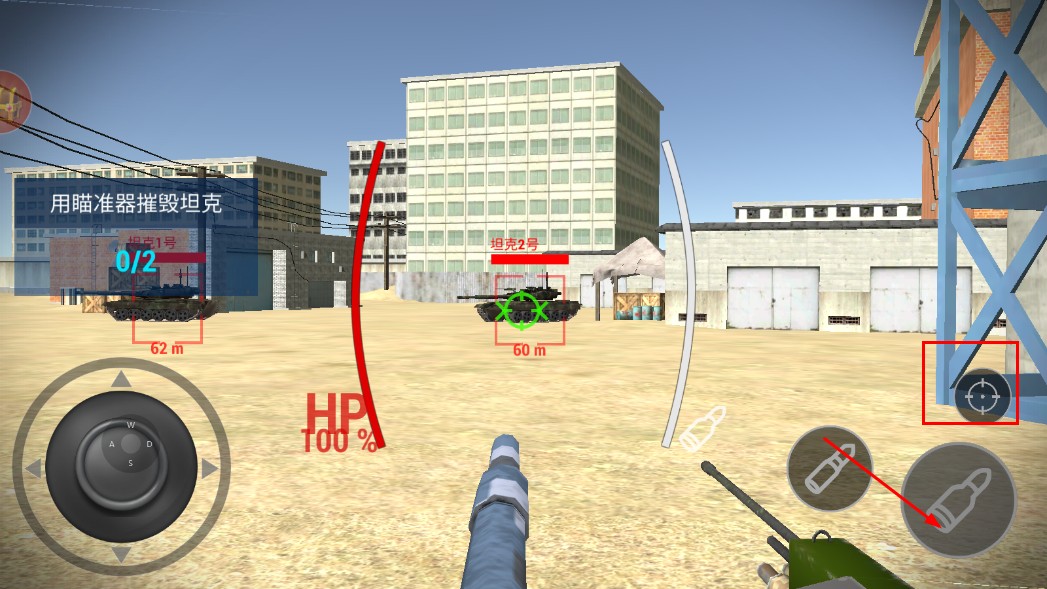 4、若需要更精准打击,可点击瞄准器按钮,开启瞄准功能,再进行攻击,提升摧毁敌方坦克的效率。
