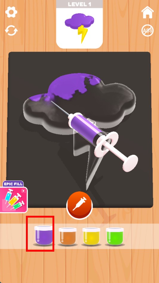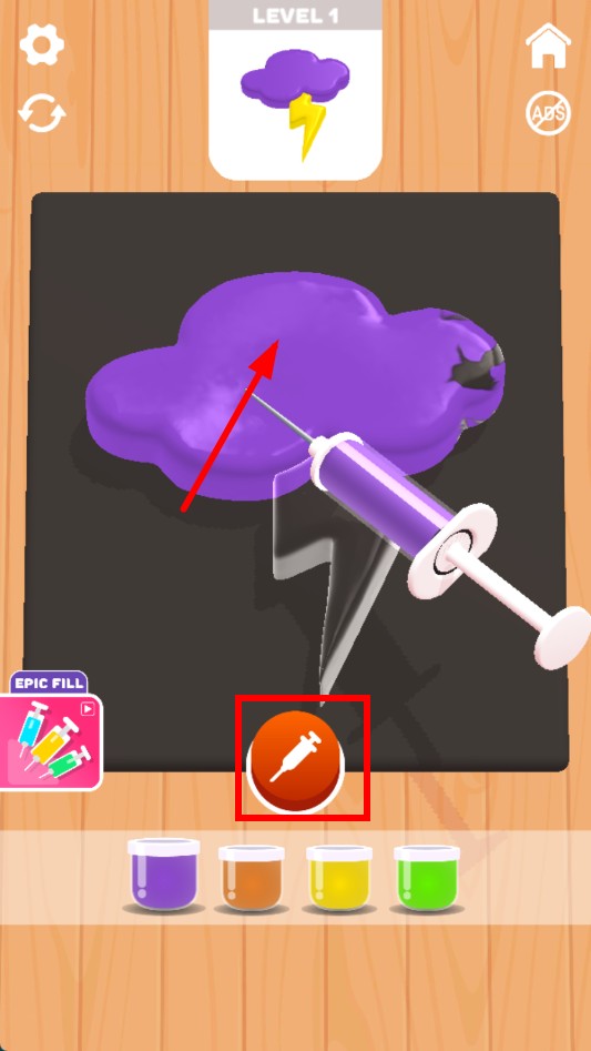 2、然后点击注射器按钮,将颜料注入云朵造型的物品内,使云朵部分变成所选颜色。