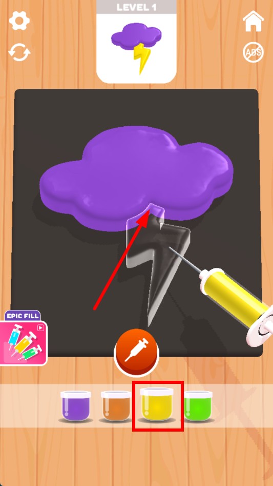 3、接着更换颜料,如黄色颜料,再次点击注射器按钮,为闪电造型部分注入颜料,使其变色。
