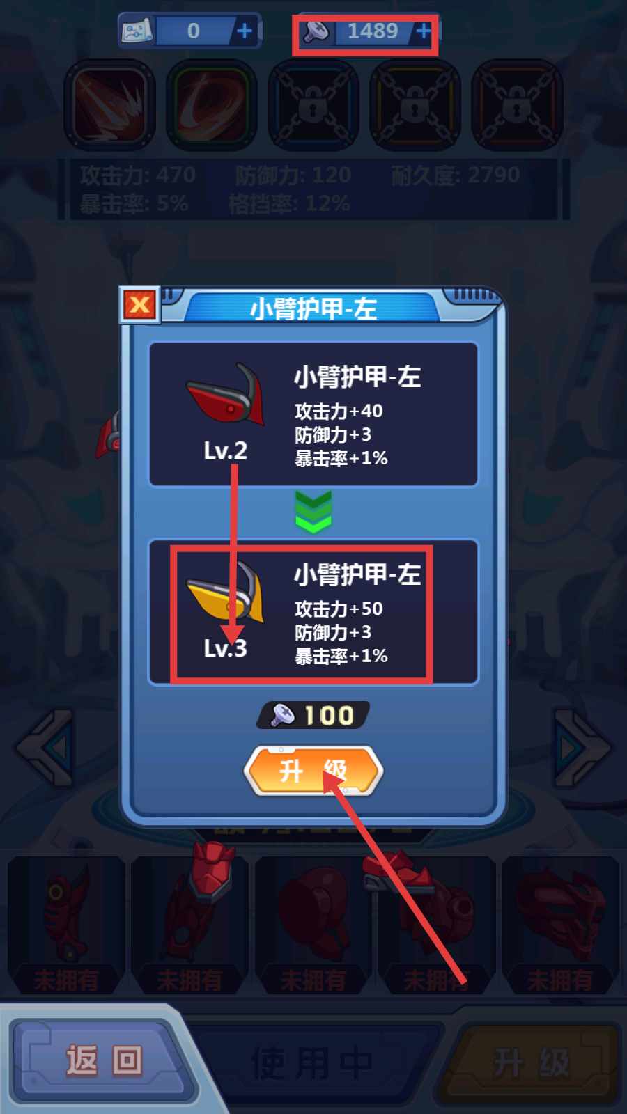 1、点击【升级】按钮,消耗【100】道具将【小臂护甲-左】从Lv.2升至Lv.3,提升攻击力等属性,强化战力。