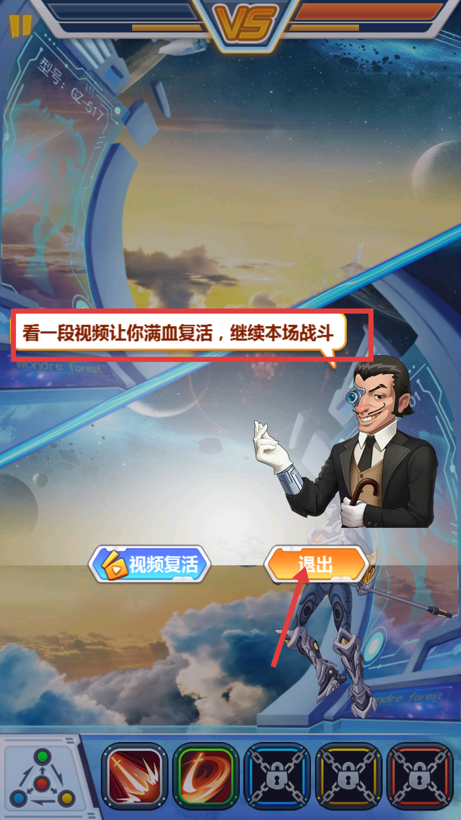 4、若战斗失败,可选择【视频复活】看视频满血复活继续战斗,或点击【退出】结束本场战斗。