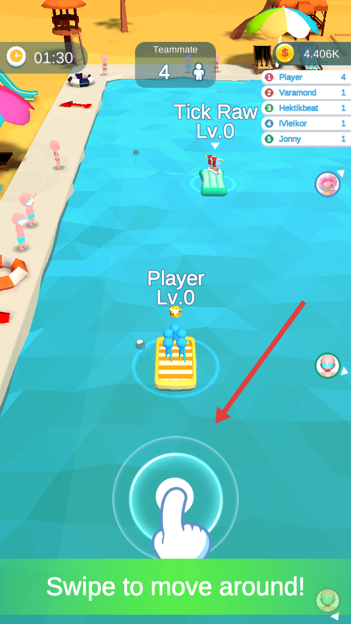 3、在泳池场景中,通过滑动操作移动皮划艇,与其他玩家竞技,争取竞技优势。