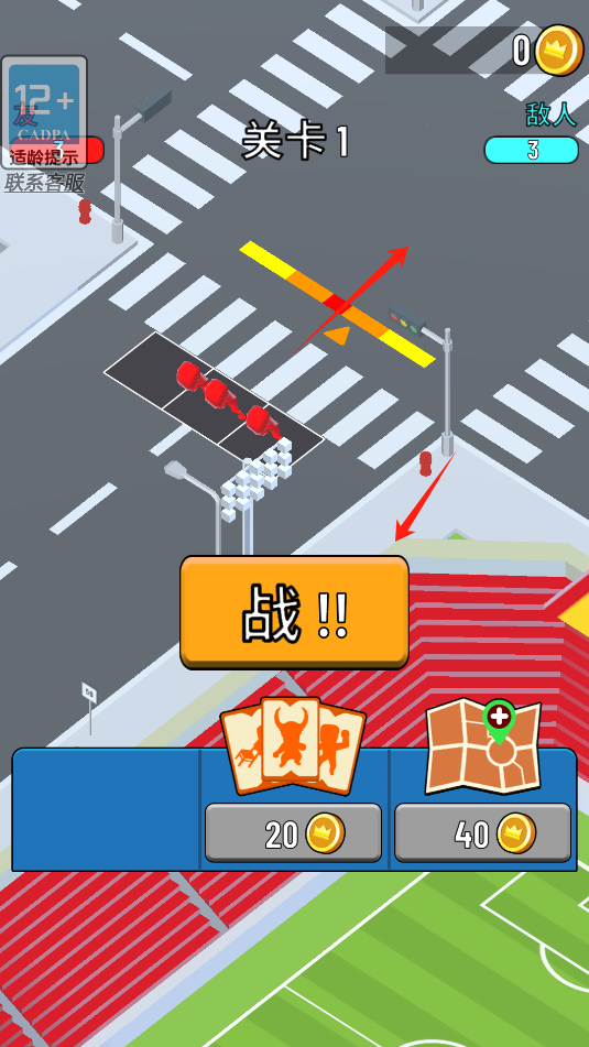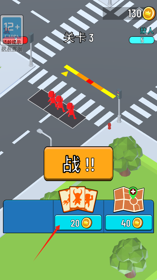1、刚开始先点击战,打败当前的敌人获得游戏币。