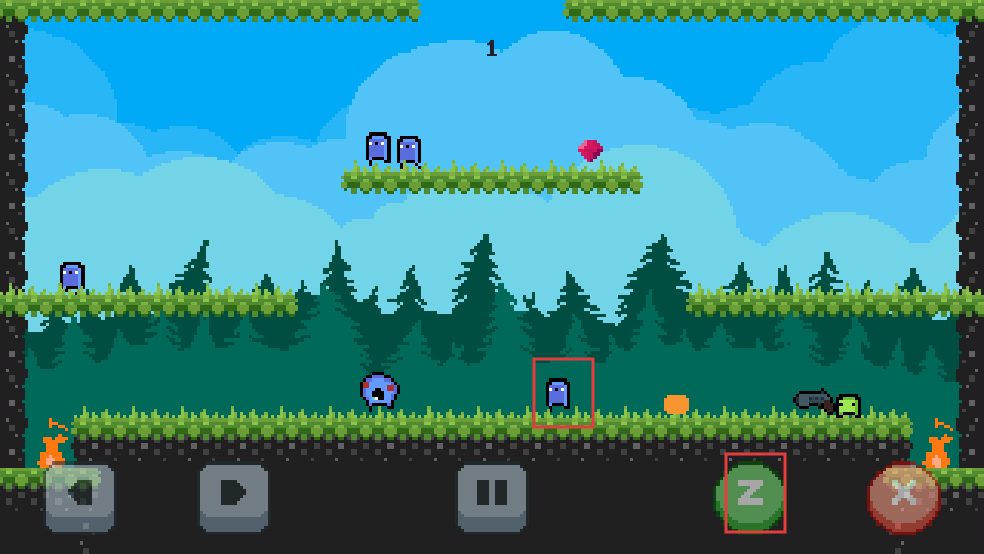 3、过程中,遇到紫色小怪,点击绿色的“Z”按钮,发射子弹击败他们,尽量多的收集钻石。