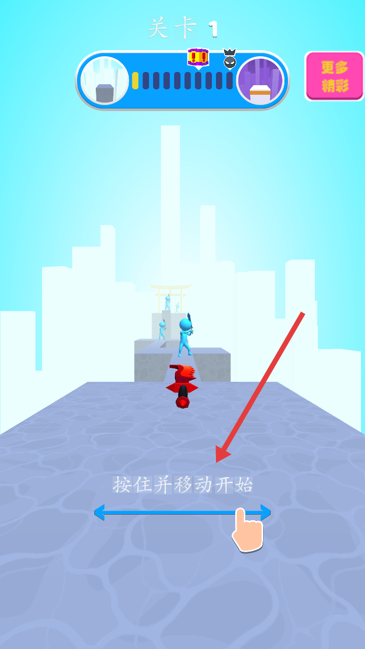 1、进入关卡1,按照按住并移动开始的提示,开启跑酷战斗挑战,在城市风格跑道上展开冒险。