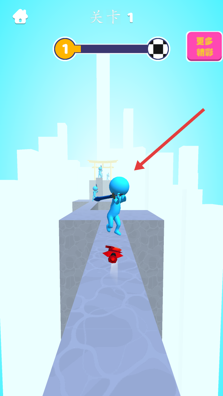 2、操控角色在跑道上前进,攻击沿途蓝色敌人,逐步推进关卡进度。