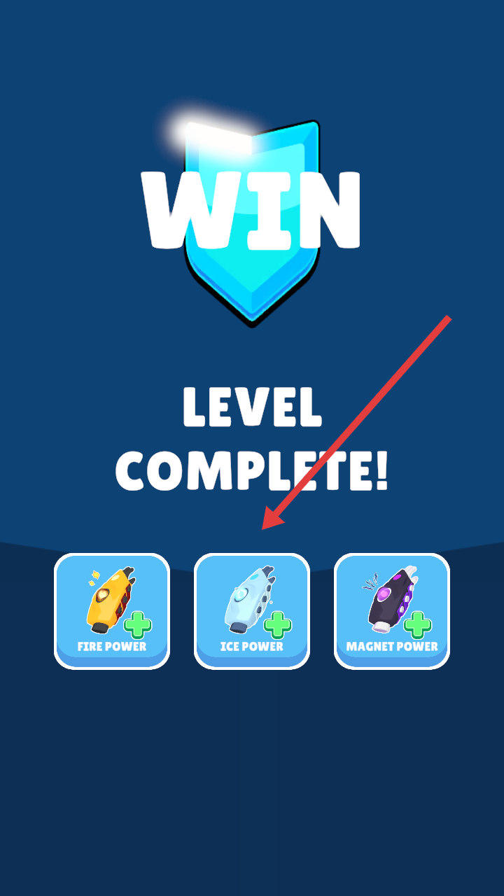 4、关卡胜利后显示LEVELCOMPLETE,选择FIREPOWER,ICEPOWER或MAGNETPOWER等奖励,继续挑战后续关卡。