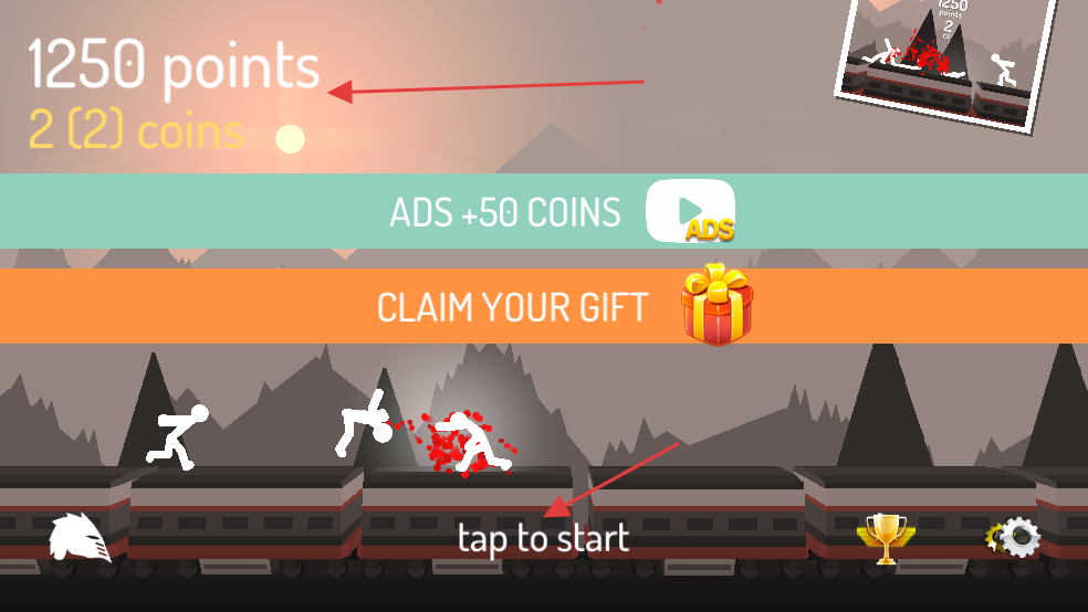 4、当一局游戏结束后,界面会显示获得的分数和金币等奖励,此时可以点击“taptostart”,开启新的对局。