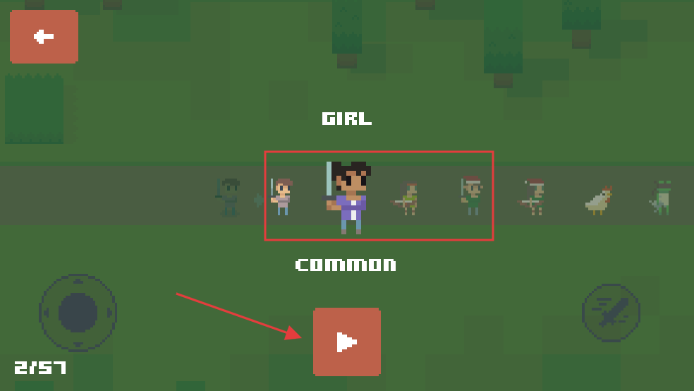 1、在角色选择界面,选好心仪的角色后,点击下方红色播放按钮,进入游戏。